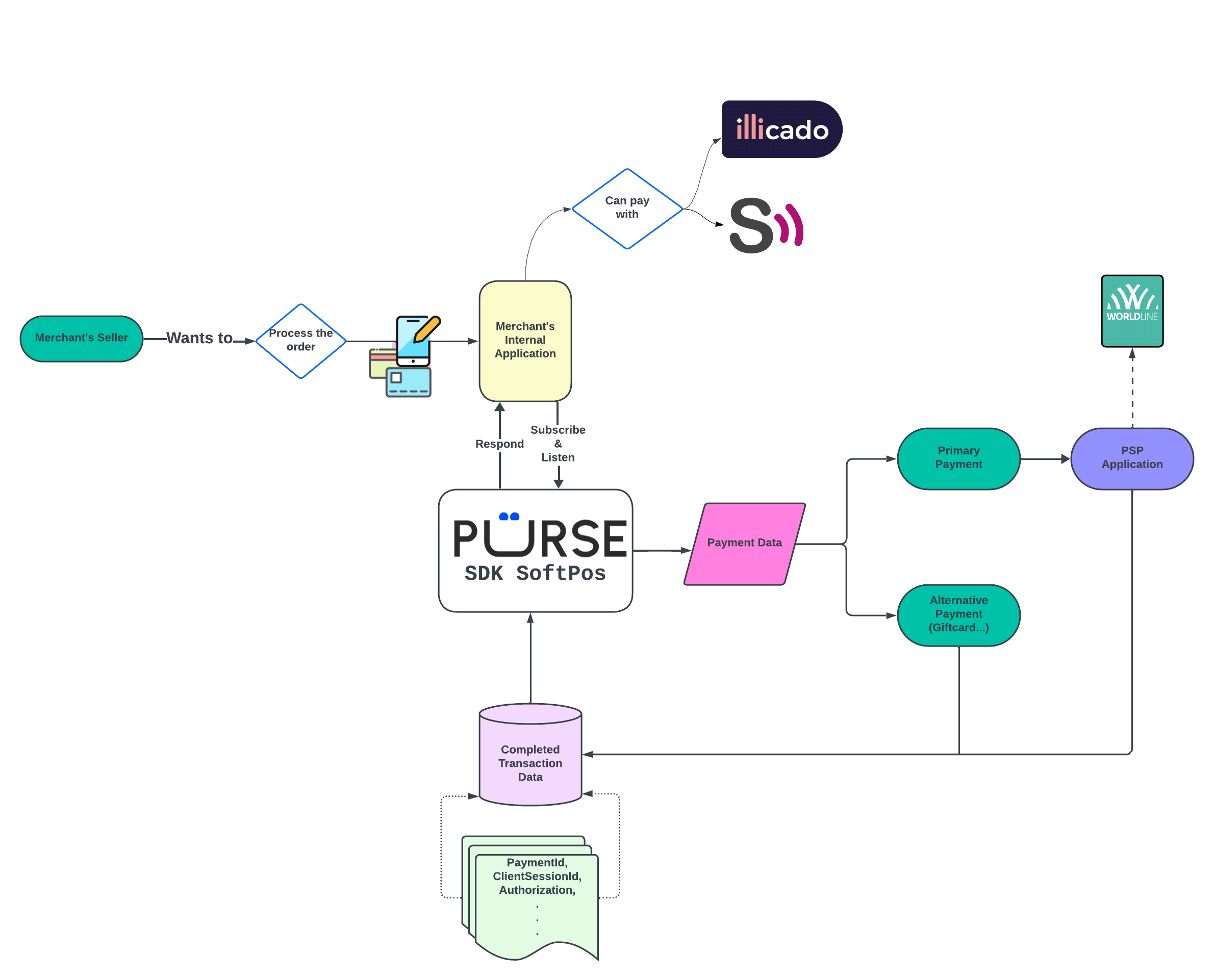 IntegrateAPIAdditional FeaturesPurse SoftPosOn this pagePurse Soft POS SDKWelcome to the Soft POS Purse page! This guide is designed to help you quickly integrate the Purse Soft POS SDK into your application. Installation Step 1: Obtain the .aar File Contact the Purse Integration Team to get the library in the form of a .aar file. Step 2: Add .aar File to Your Project Copy the .aar File: Place it into the libs directory of your Android Studio project. Create the folder if it doesn’t exist. Open build.gradle (Module: app)` Add dependency: implementation files('libs/PurseSdk.aar') Sync Gradle: Click "Sync Now" or use "File > Sync Project with Gradle Files" ProGuard Configuration If you are using ProGuard or R8, no additional configuration is required for the Purse SDK. The necessary rules are already bundled. You’re now ready to start using the SDK. Explore further to implement all features, or contact our support team if you need help. Overview of the Soft POS SDK This document provides an overview of how to integrate and use the Soft POS SDK in your mobile application. How Does the Soft POS SDK Work? SoftPos schema Step 1: Create a Session To use our SDK, a valid client-session is required. Refer to the API Section for session creation. In the create-session response, you'll find the widget.data field: { "id": "f3abdc01-1dce-4663-ad02-7e65591e4cca", "widget": { "data": "aHR0cHM6Ly93d3cueW91dHViZS5jb20vd2F0Y2g/dj1kUXc0dzlXZ1hjUQ" }} Step 2: Initialize the SDK Initialize the SDK by creating a PurseSDK object: val purseSDK = PurseSDK() Then launch the SDK with: purseSDK.launch(widget.data, context) Step 3: Handle Transaction Status and Feedback Set a transaction listener: purseSDK.transactionListener = this Transaction End You receive a PurseRedirectionData object on completion: override fun transactionFinished(purseRedirectionData: PurseRedirectionData) {} Example: PurseRedirectionData( paymentId = "c920c394-1896-4179-b278-1503f37dd0dc", clientSessionId = "c9a3abdd-b583-415a-9b77-228891be74ed", authorizationStatus = AUTHORIZED, encoded = "eyJraWQiOiJiNzY5ODA5YS01ZTIwiOiJSUzI1_Q") Handling Errors override fun transactionError(error: PurseError) {} Example error: PurseError(message = "La session est invalide.")