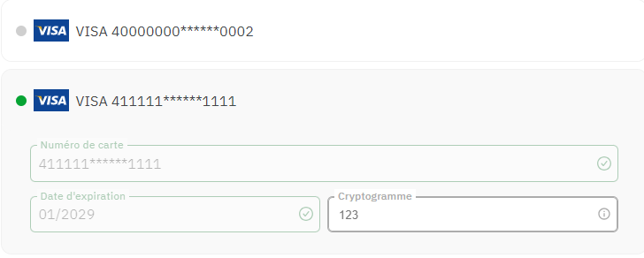 The next time a customer checks out, the widget will display their saved payment methods.