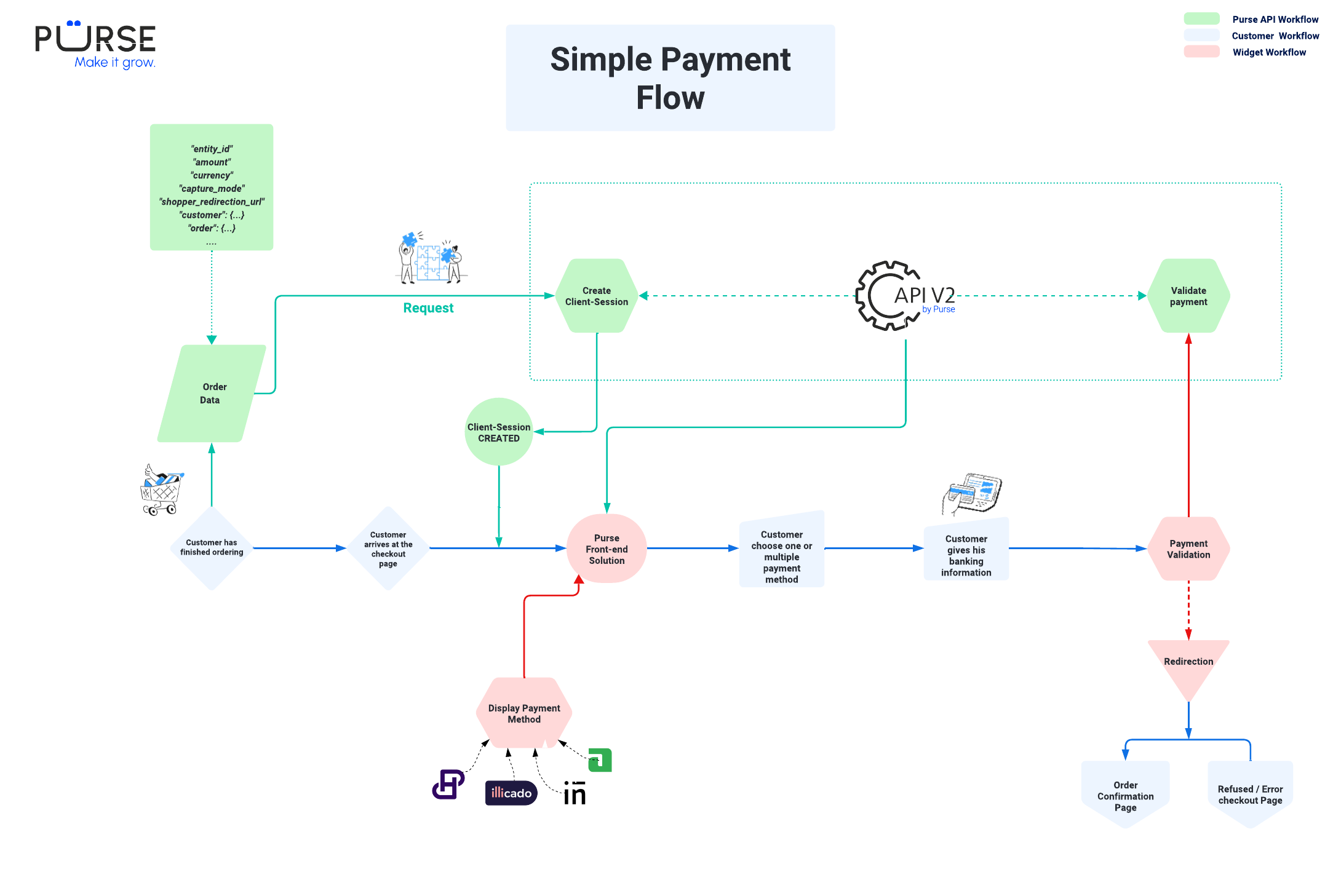 The Purse system is designed to orchestrate and simplify online payments. Whether you're dealing with cards, wallets, gift cards, or split payments, the process remains consistent and fully traceable.